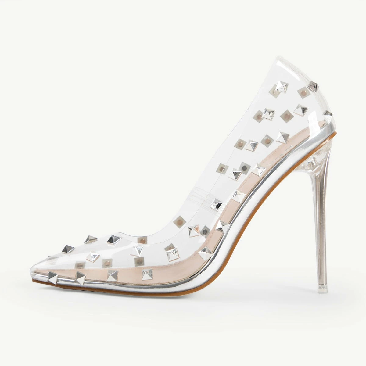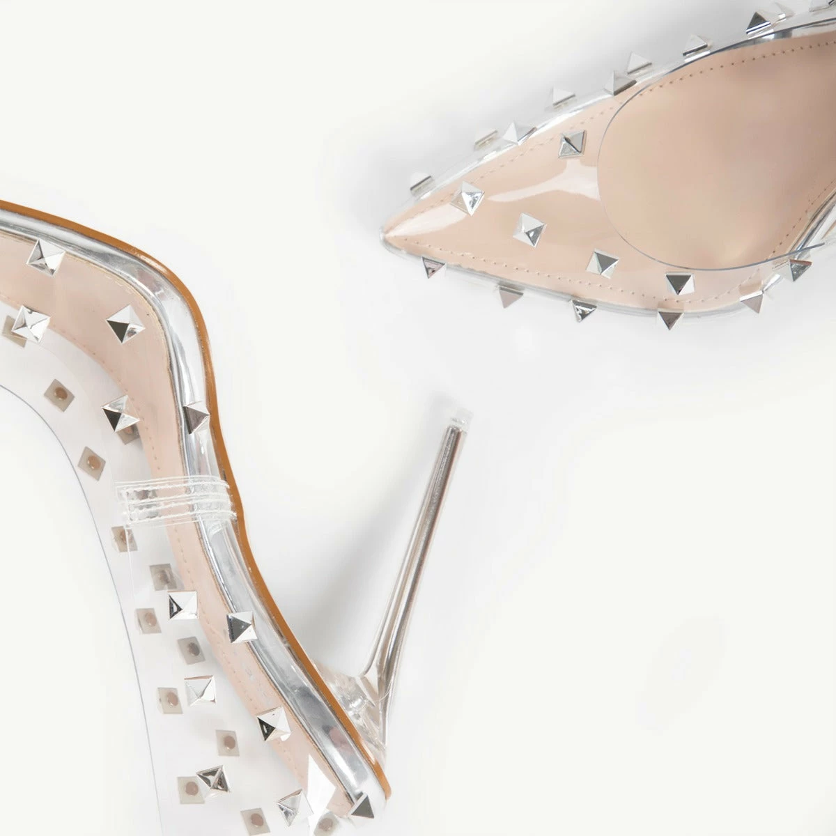 Introducing the BEBO Mayra: the perfect combination of style and sophistication. This elegant Perspex court shoe is elevated with silver studs and a high heel for a timelessly glamorous look. Its pointed toe adds a striking touch, making it the perfect accessory for any special occasion. Make a statement with the BEBO Mayra!