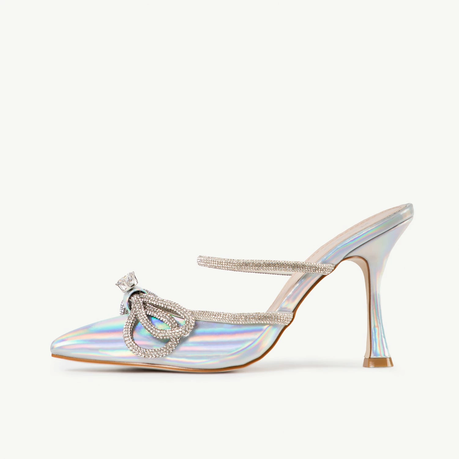 The BEBO Ruhani Heeled Mule in Silver is a show-stopping shoe that is sure to turn heads. Featuring a holographic silver finish with a sparkling diamante bow, this mule is a stunning addition to any wardrobe. Keep your style looking fresh with this unique and eye-catching mule.
