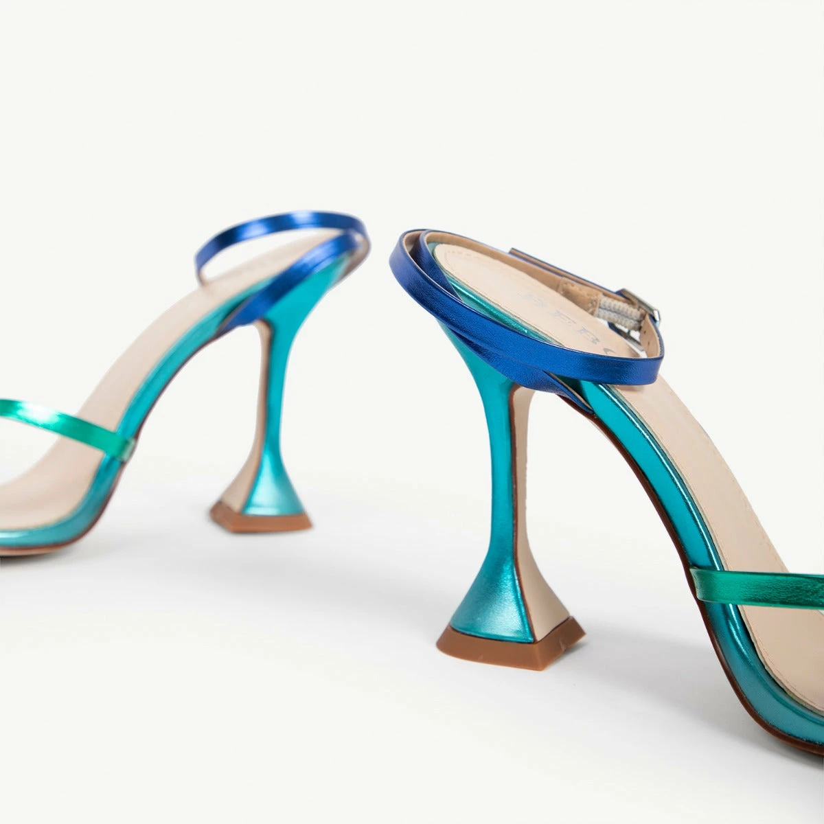 The BEBO Trevia Sandal is an eye-catching statement piece, with a multi metallic blue finish that’s sure to get noticed. It features a bold, flared heel and strappy silhouette, making it both an on-trend and timelessly stylish choice.