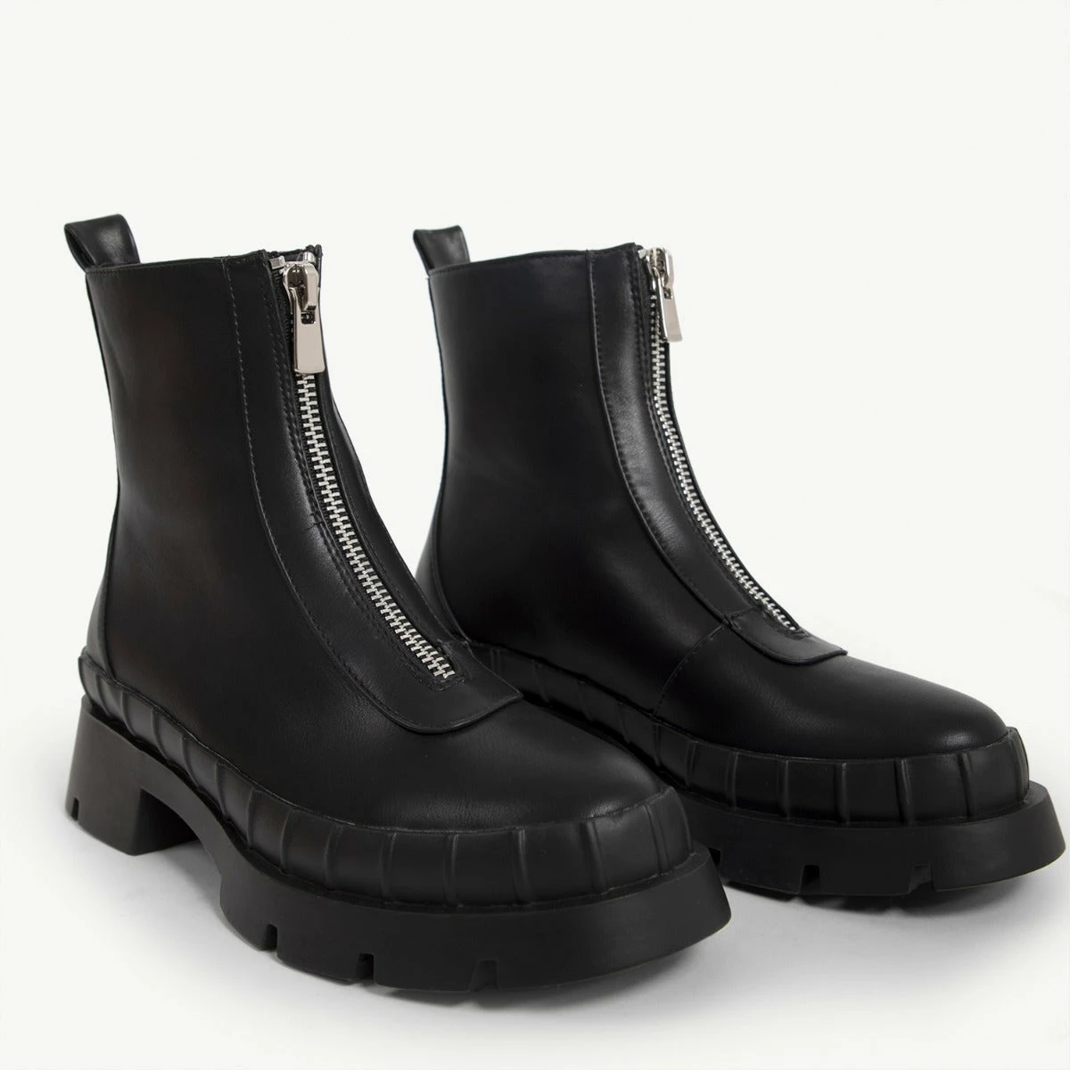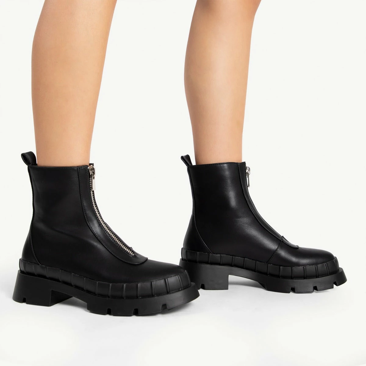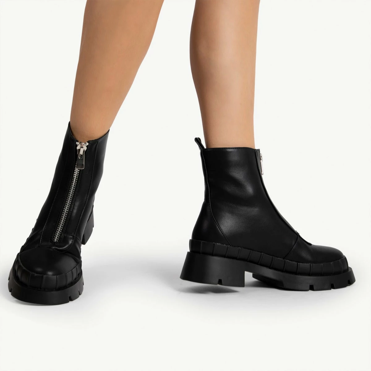 The RAID Annya Chunky Ankle Boot captivates in its sleek black design. Combining a chunky silhouette with a front zip closure, these boots will make you look and feel like a fashionista. Step out in style with the Annya Ankle Boot!