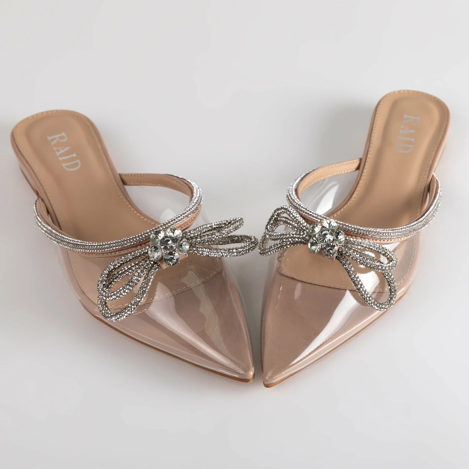 Make a lasting impression with the RAID Ariette Embellished Flat Mule! This glamourous mule features a dazzling diamante bow and clear and nude design that exude modern elegance! Put your best foot forward with this stylishly chic and comfortable flat.