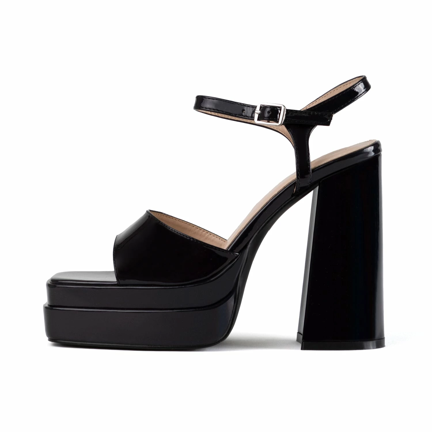 Capture the night in the sleek and stylish Cassilia Block Heeled Sandals. Crafted from glossy patent material, these beautiful black sandals feature a platform sole, ankle strap and block heel for ultimate comfort and style. Dance the night away with a shoe that speaks for itself.