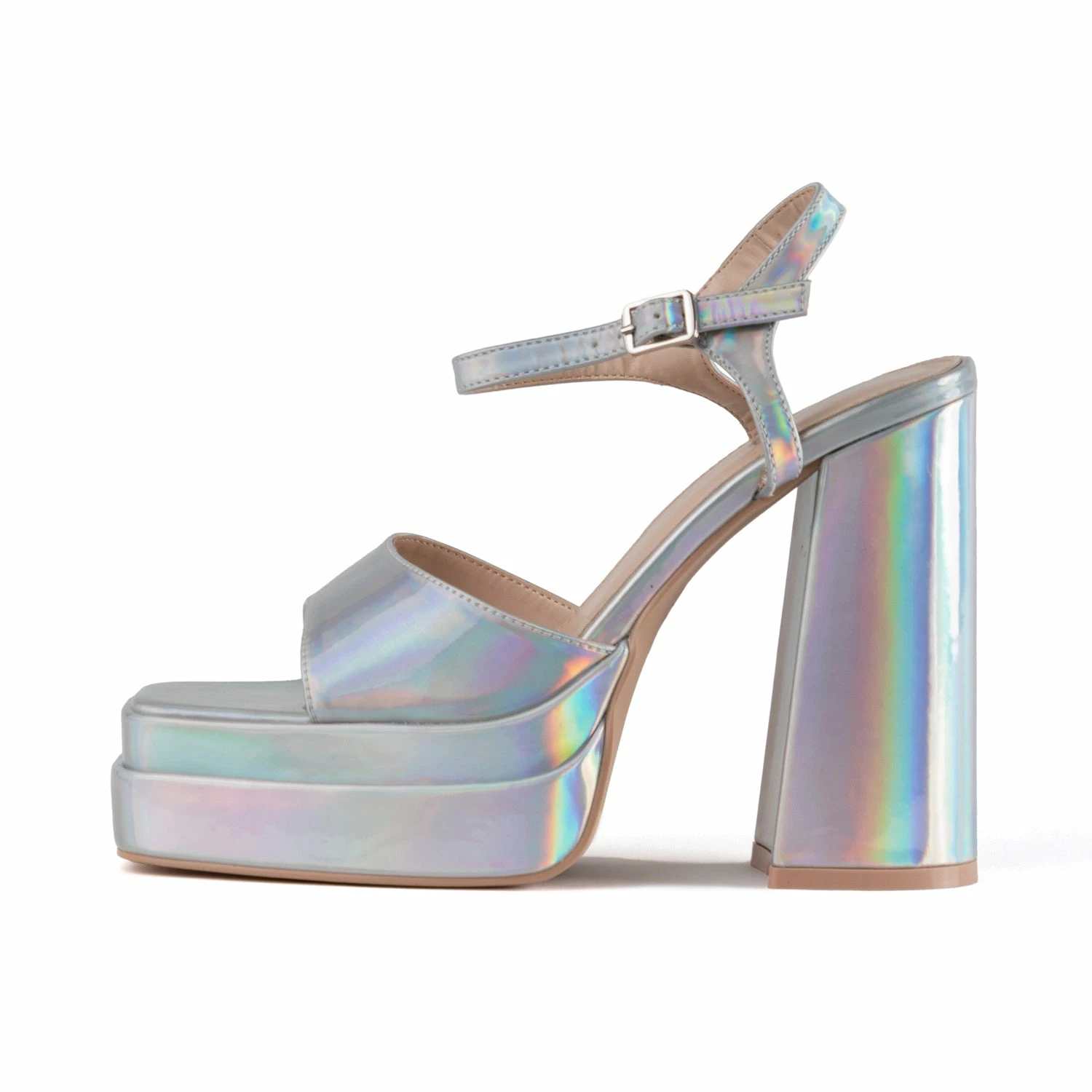 Capture the night in the sleek and stylish Cassilia Block Heeled Sandals. Crafted from glossy patent material, these beautiful silver sandals feature a platform sole, ankle strap and block heel for ultimate comfort and style. Dance the night away with a shoe that speaks for itself.