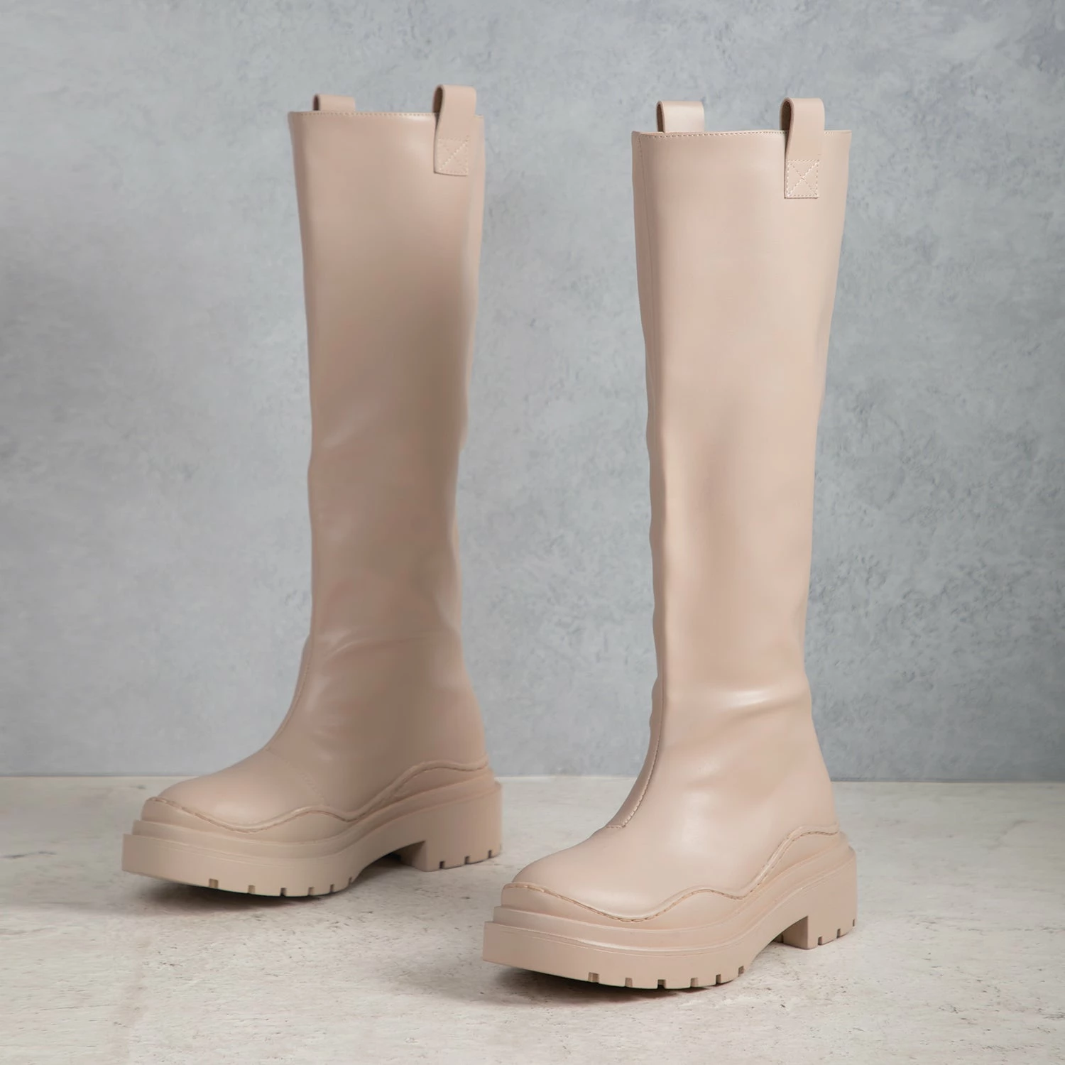 Enjoy a fashionably bold look with these eye-catching RAID Catania Long Boots in Nude! Their smooth, Nude leather and biker boot design bring a modern edge to any festival outfit. Pull-on style and knee-length fit make them easy to wear and combine with any look. Make a stylish statement!