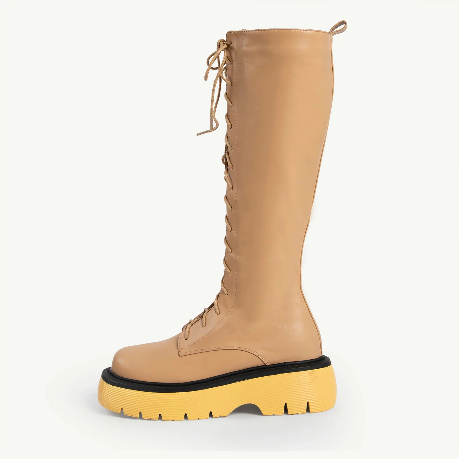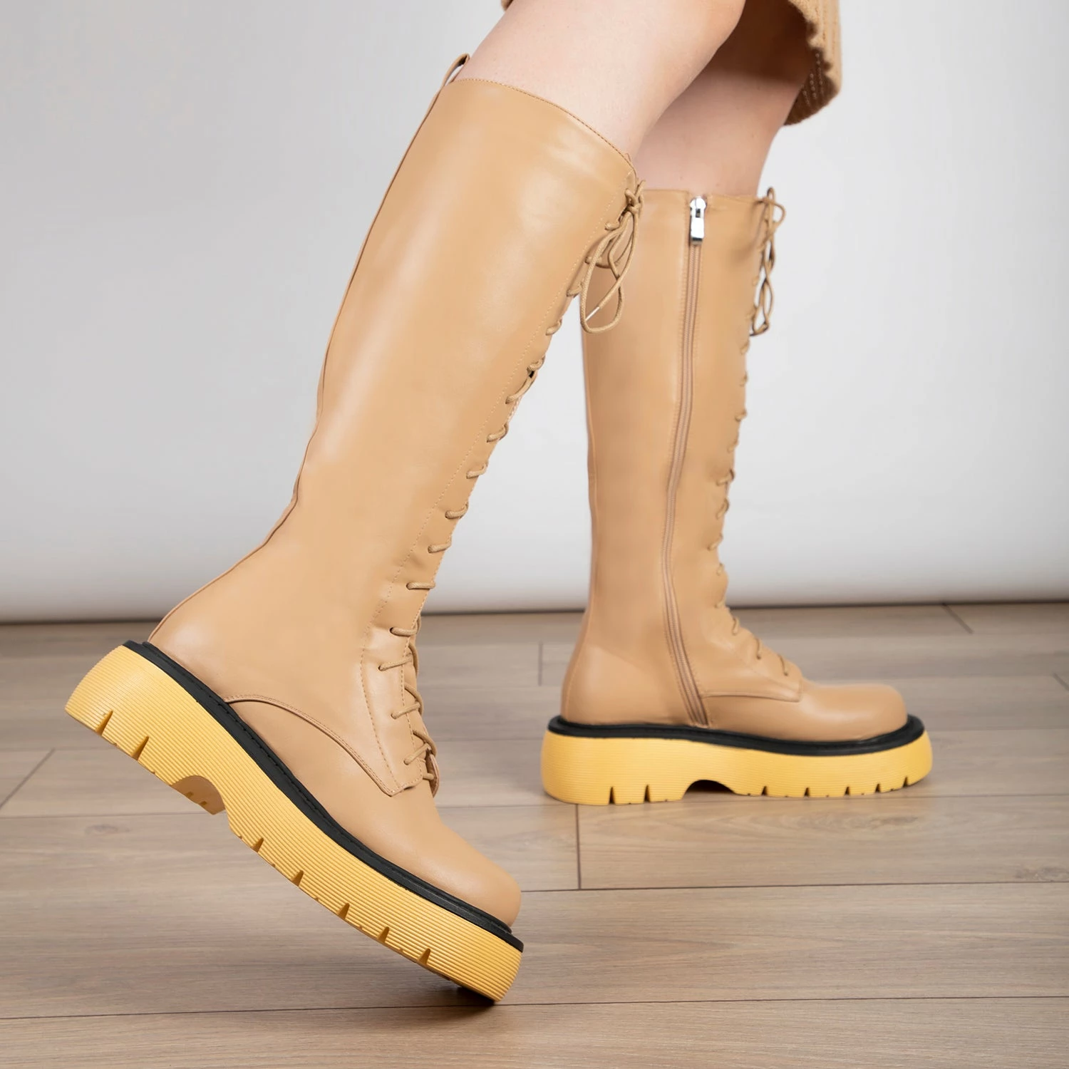 Step into fall with these chic RAID Colira Long Boots in Camel. Crafted with a knee-high combat boot design, featuring a lace-up detail and a chunky rounded sole, these boots are perfect for adding an undeniable edge to any outfit. Make a statement in style!