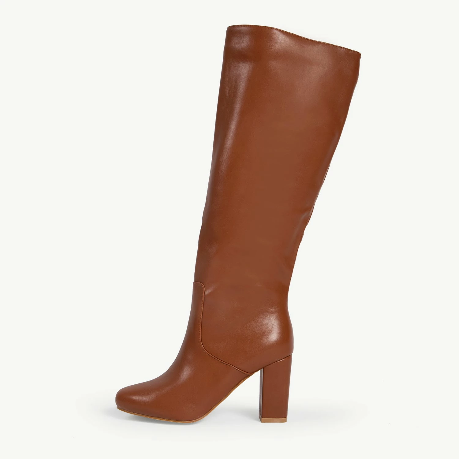 Take on chilly weather in style with these RAID Dileni Wide Fit Long Boots! Featuring a tan upper and a block heel, these boots will keep you warm and comfortable for hours. Make it your go-to boot for the season!