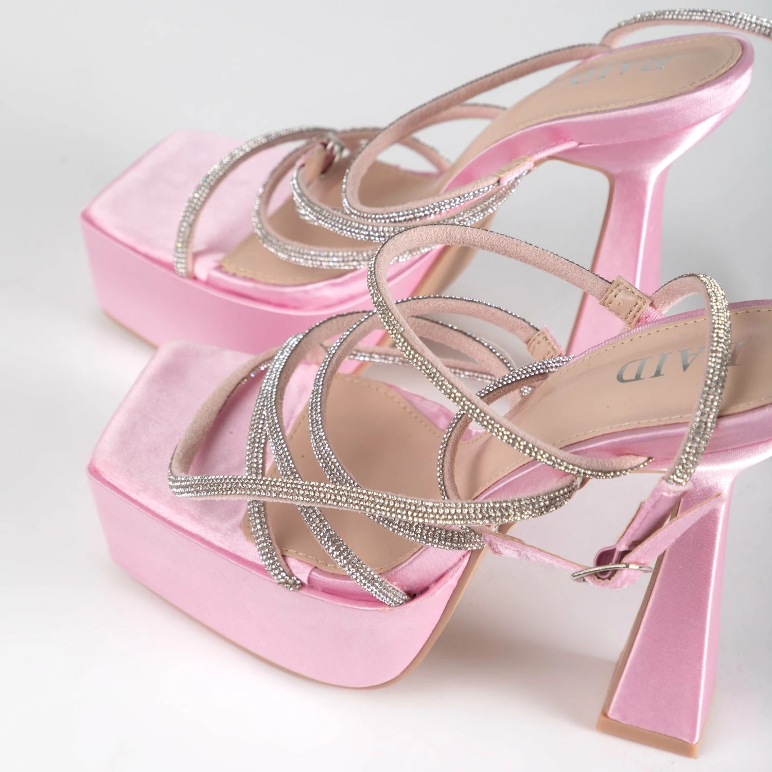 Walk fearlessly in the RAID Fiora Platform Heel. This stunningly beautiful pink heel was designed with multiple diamante straps, a platform for stability, and an ankle strap for support. Make a statement in these exquisite heels!