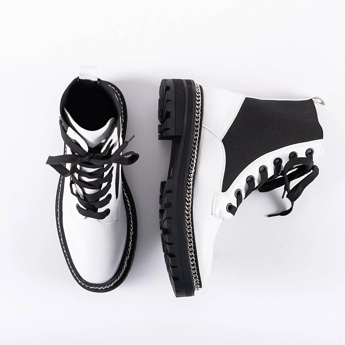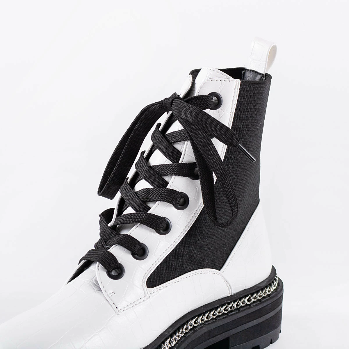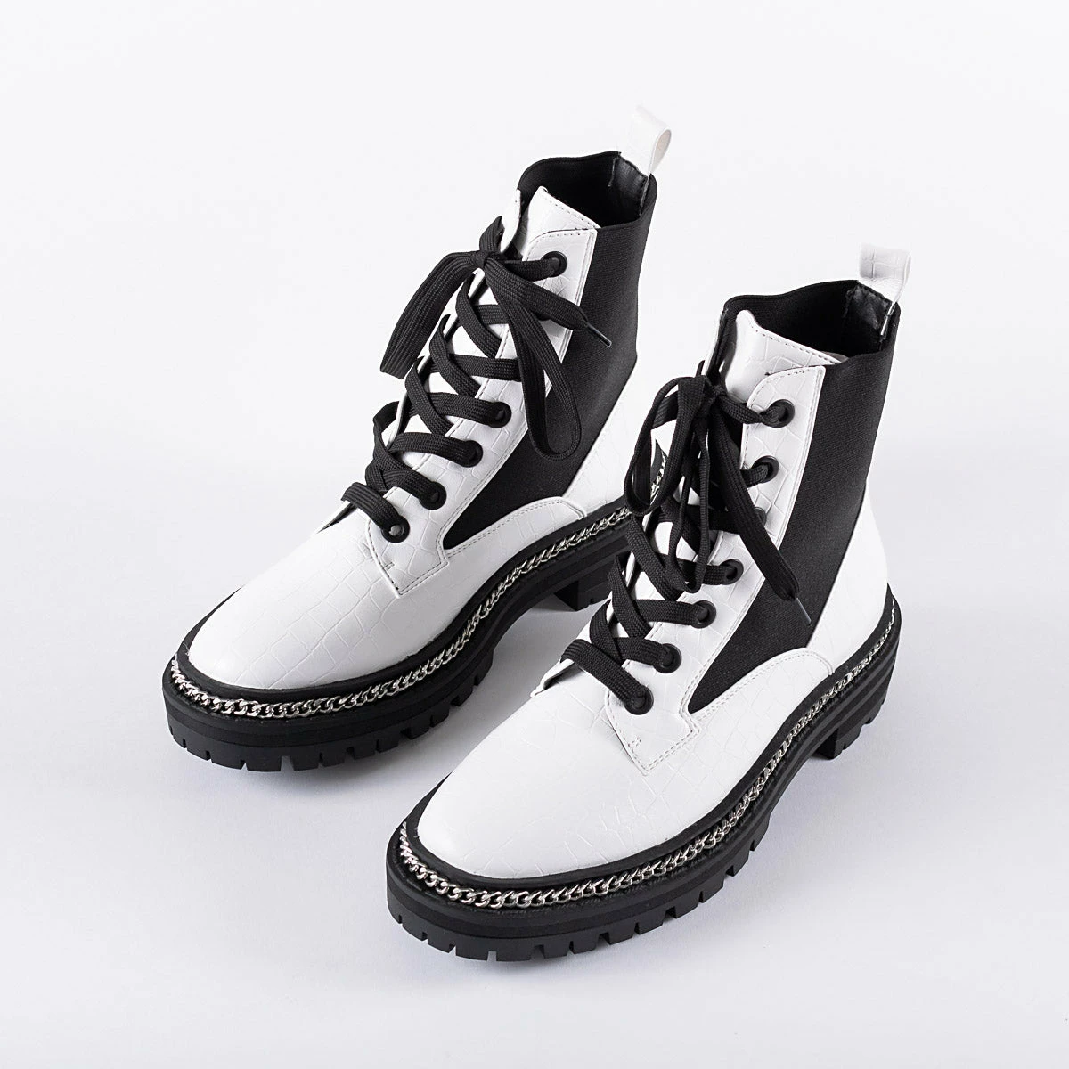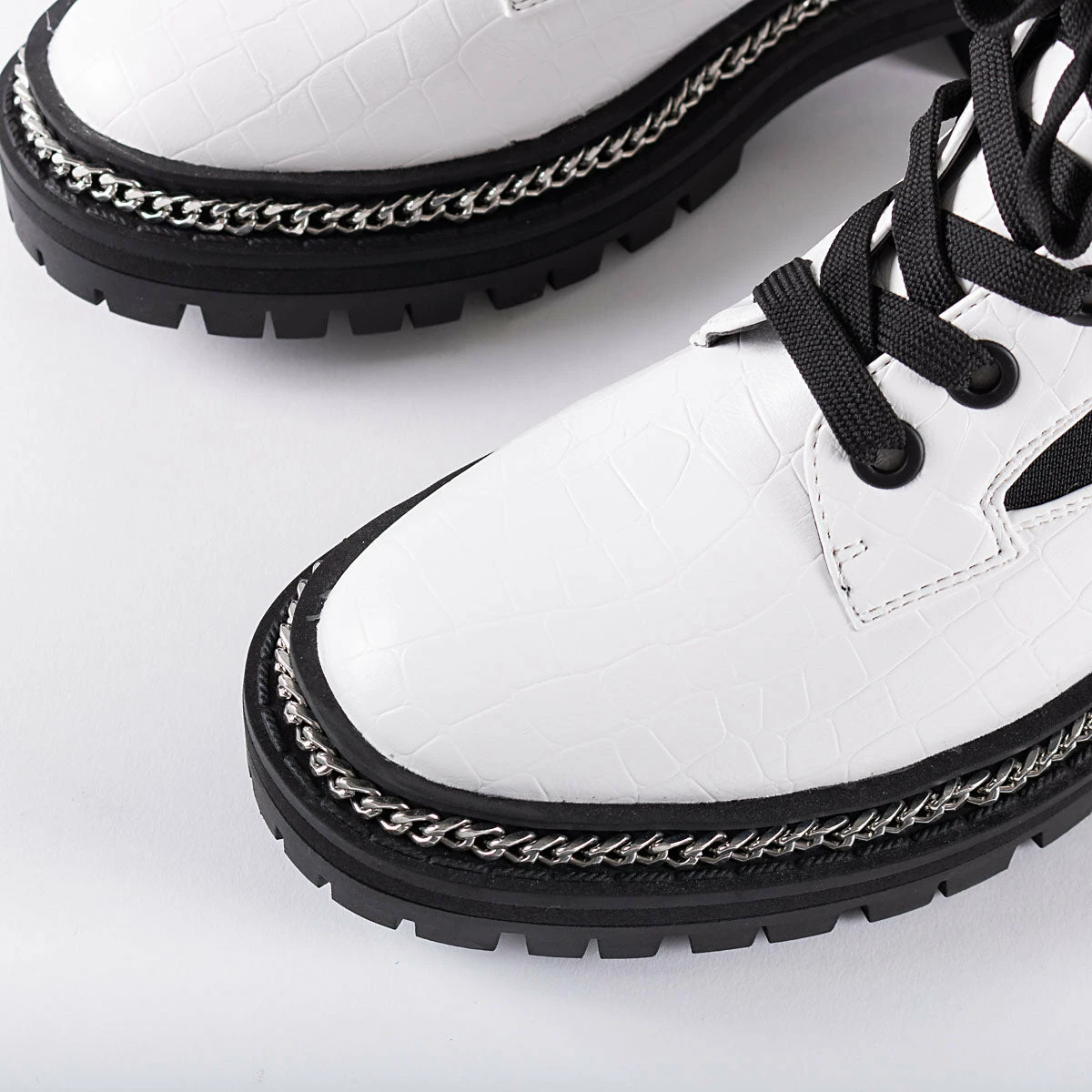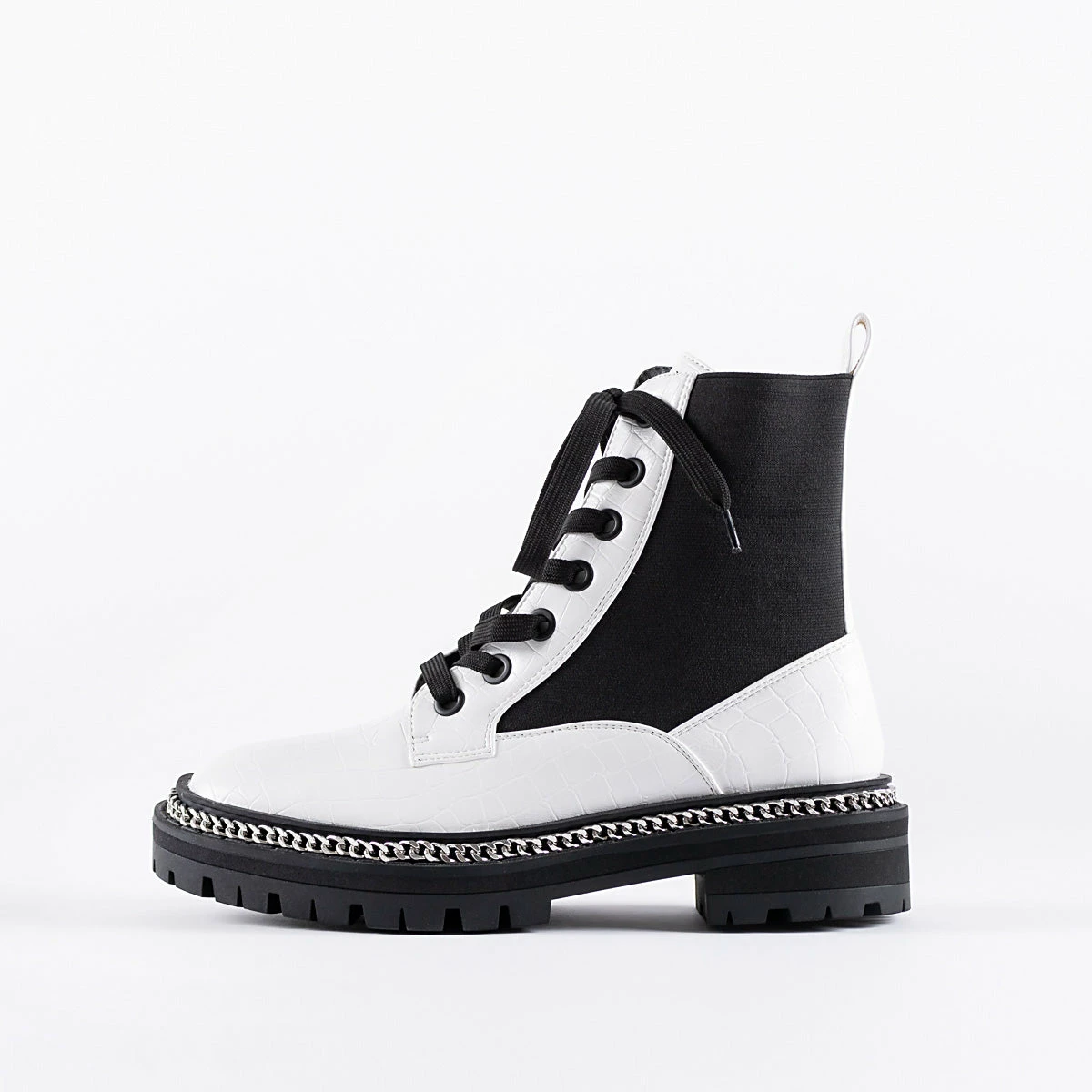 Stay on trend this season with the Lorelle Chunky Hiker Boot from RAID. Designed with a sleek white finish, luxe chain detailing and a secure lace-up front, these stylish boots will take you from day to night with ease and style. Are you ready for your fashion makeover?