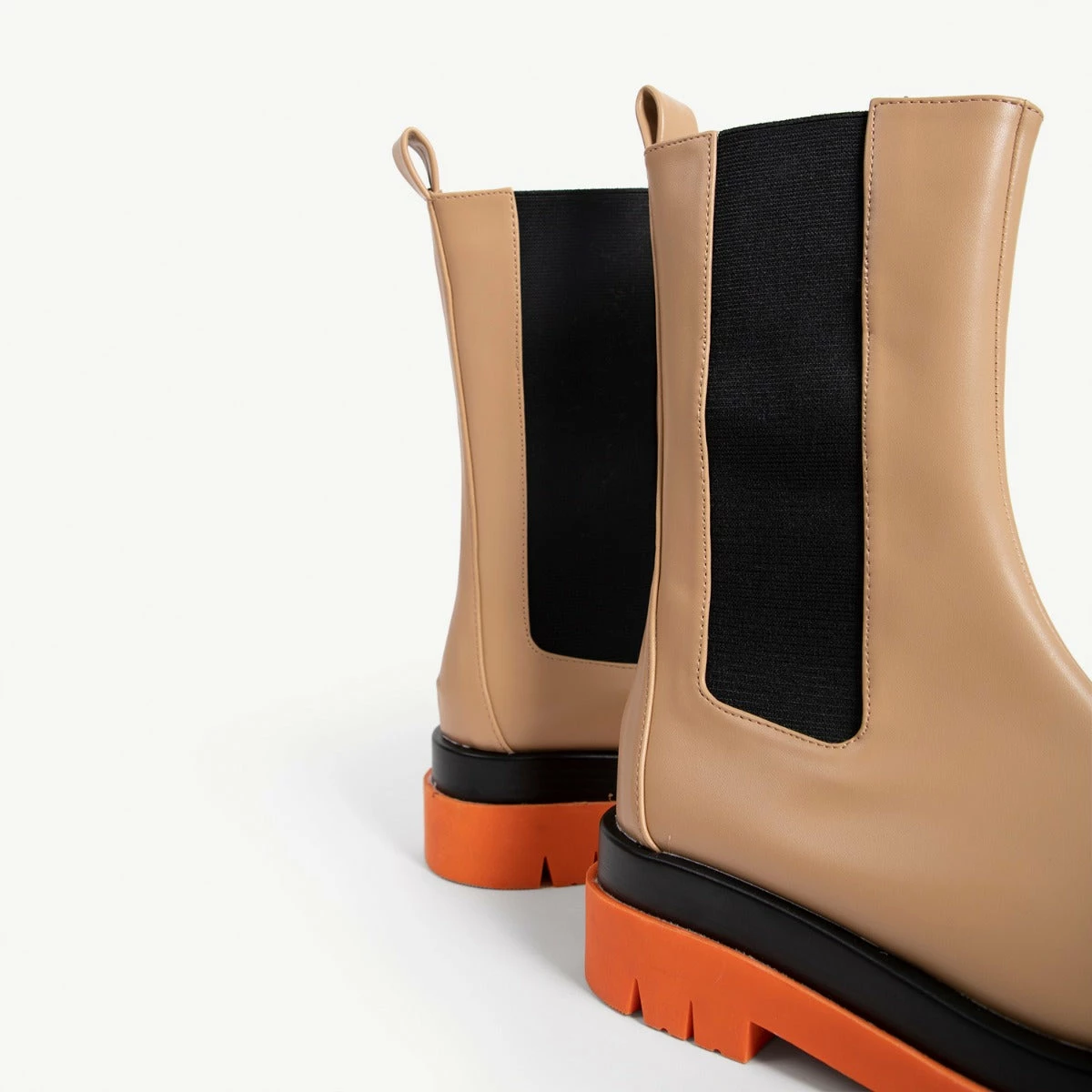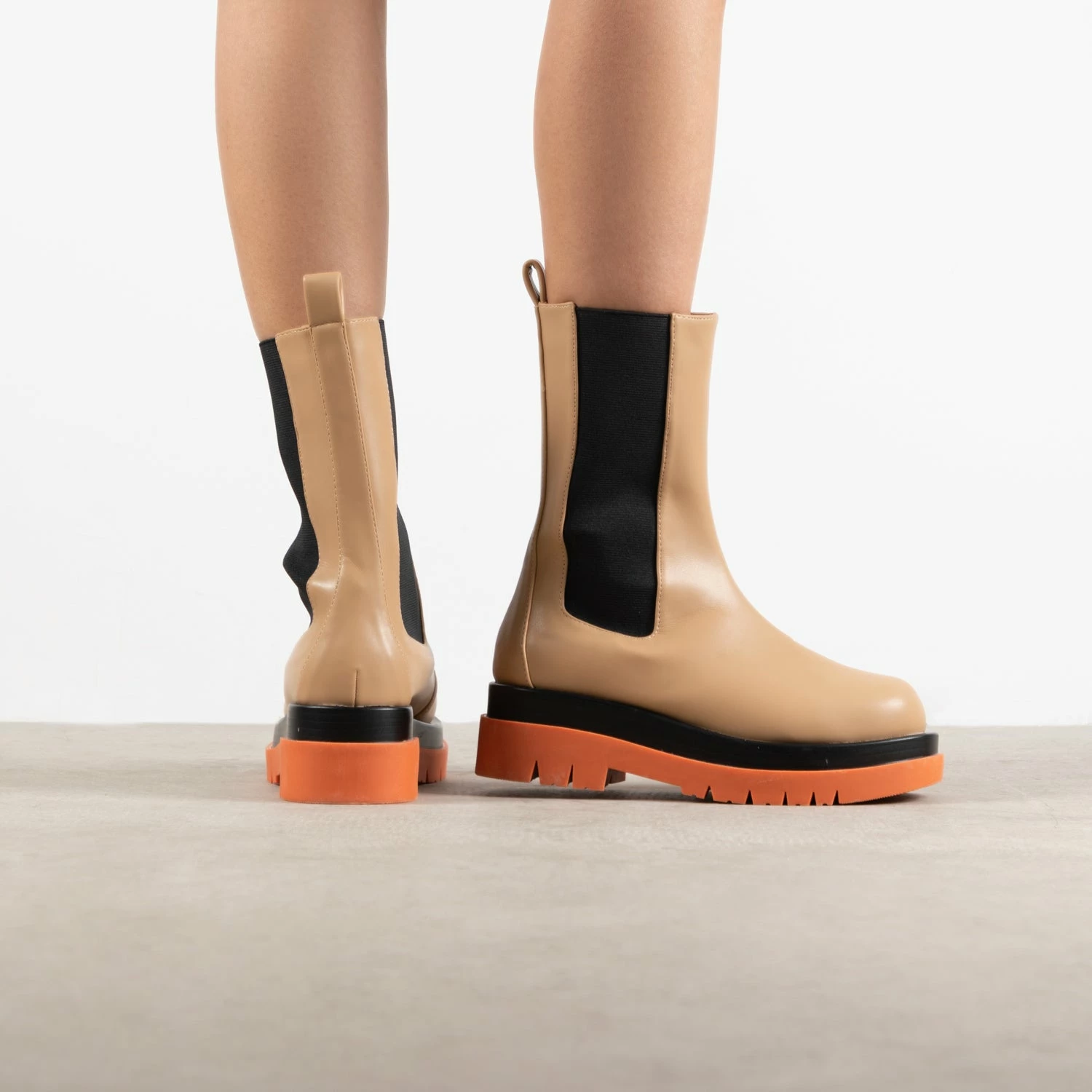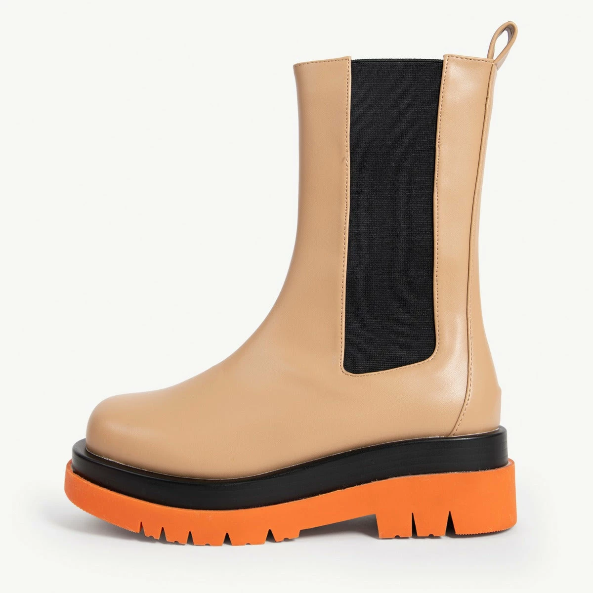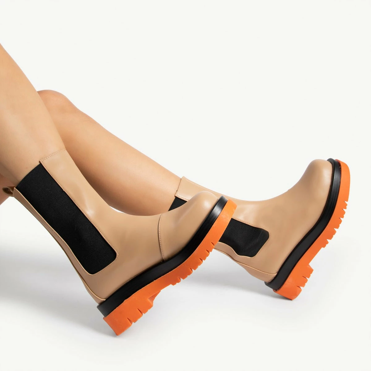 Make a statement wherever you go in the RAID Neville Chunky Boot! This gorgeous chunky boot stands out with its striking orange sole and smooth camel finish. Perfect for both work and play, this timeless style will see you through the season in comfort and style!