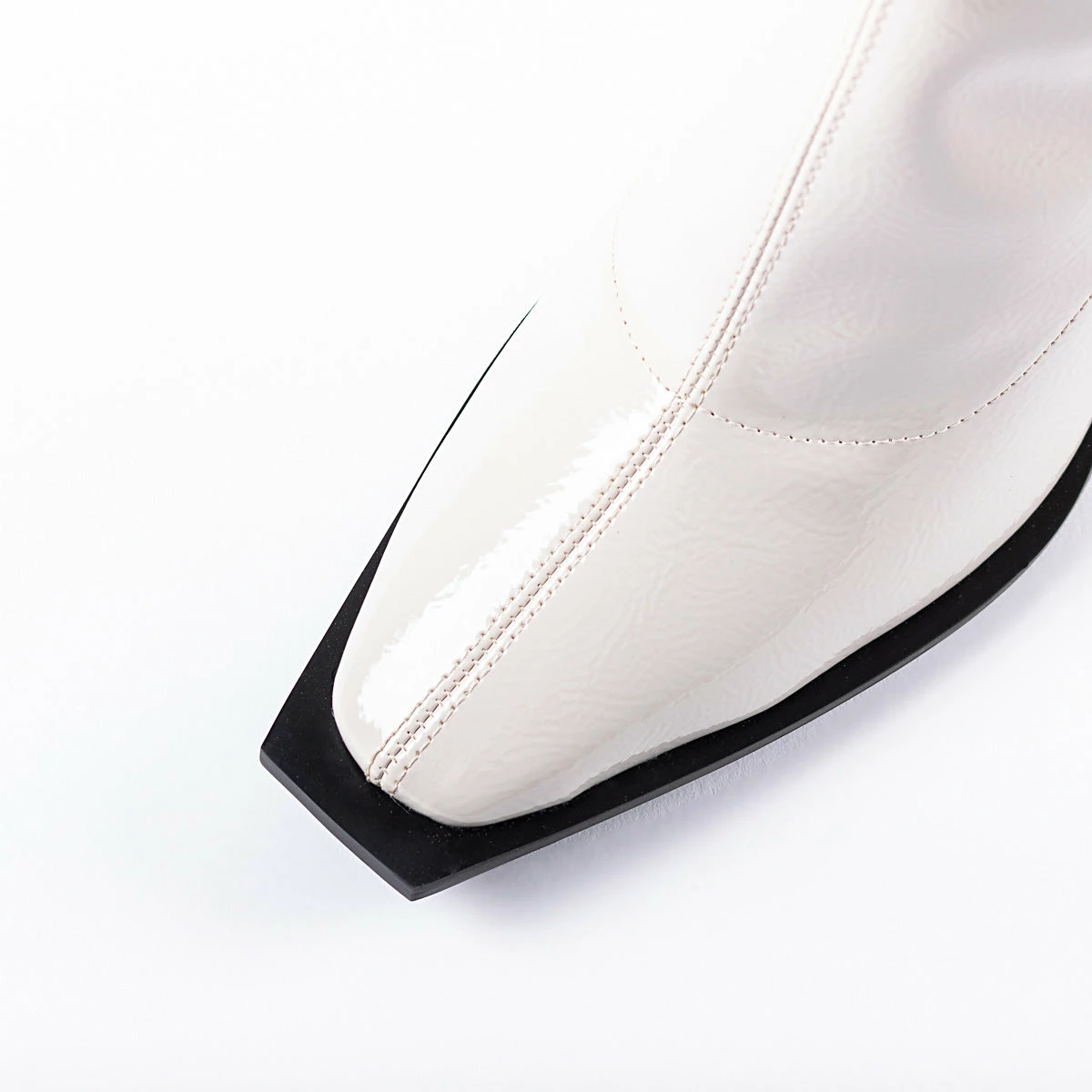 The perfect 90โs boot for this season. With a white patent finish, flared block heel and sock boot fit, Valencia is the must have boot for AW19-20. With the ultimate luxe look these boots will look perfect with a blazer dress and an 80โs waist belt.
